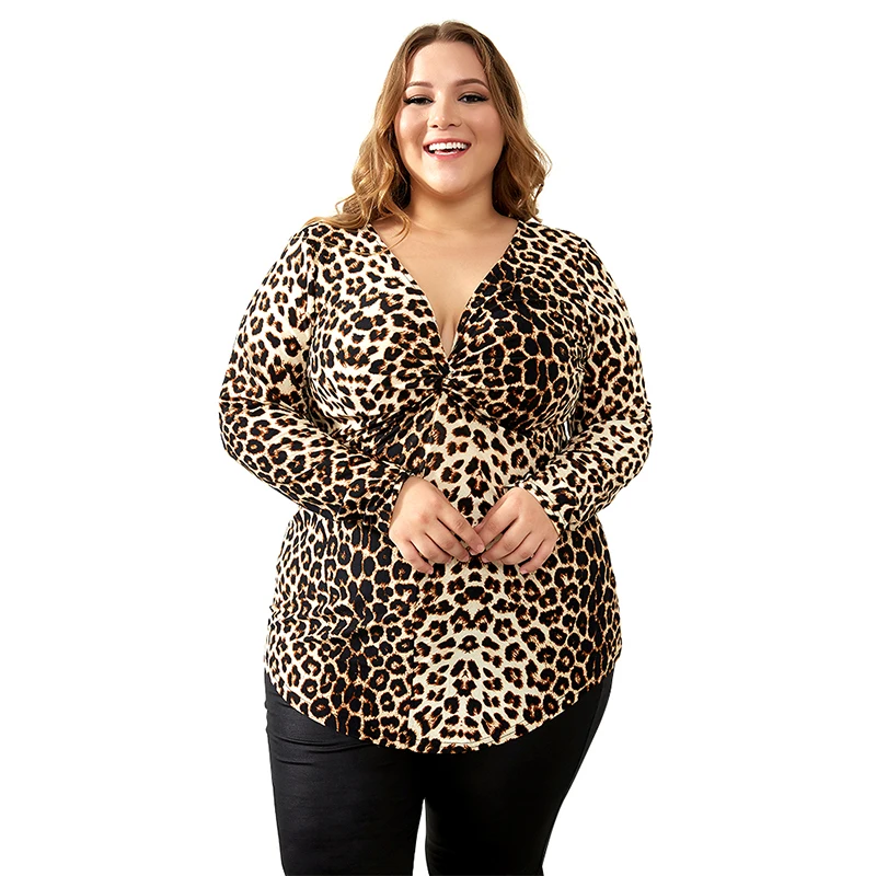 astounding YTL Plus Size Blouses for Women Leopard Sexy Deep V Neck Long Sleeve Slim Tunic Top Large Size Blou