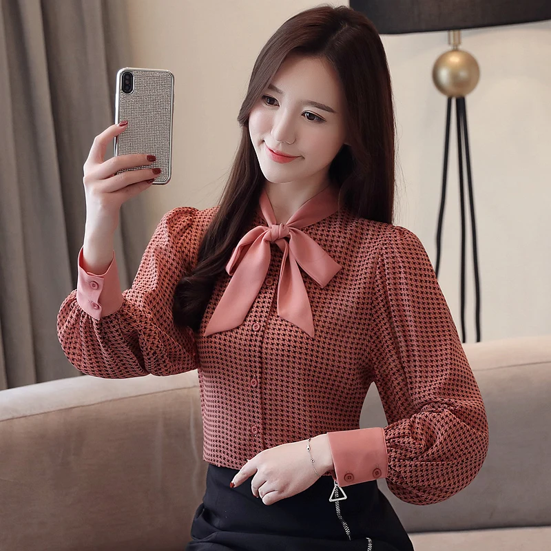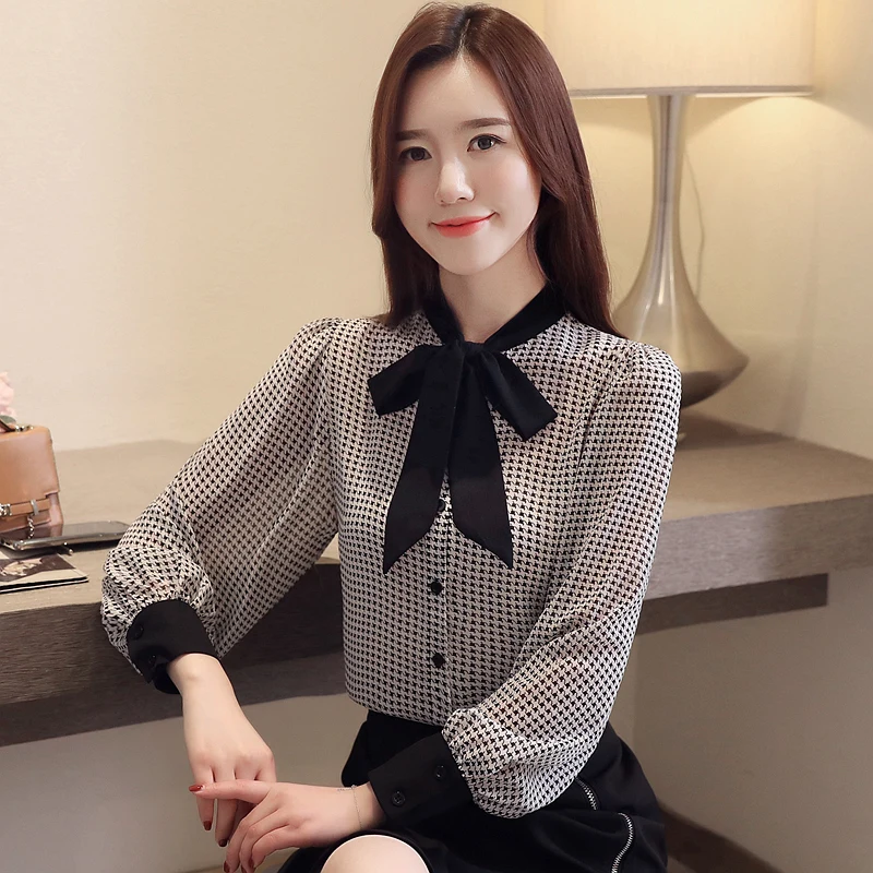 lower price womens tops and blouses long sleeve women shirts fashion bow collor office blouse women plaid chiff