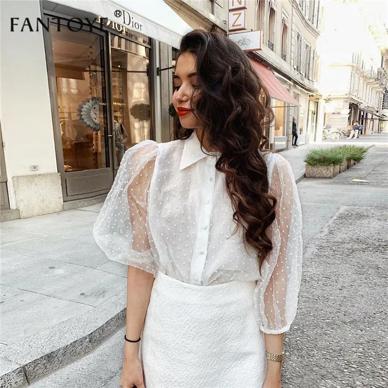 price cut Fantoye Spring New Women Chiffon Blouse Shirt Sexy Transparent Mesh Beading Puff Sleeve Female offi