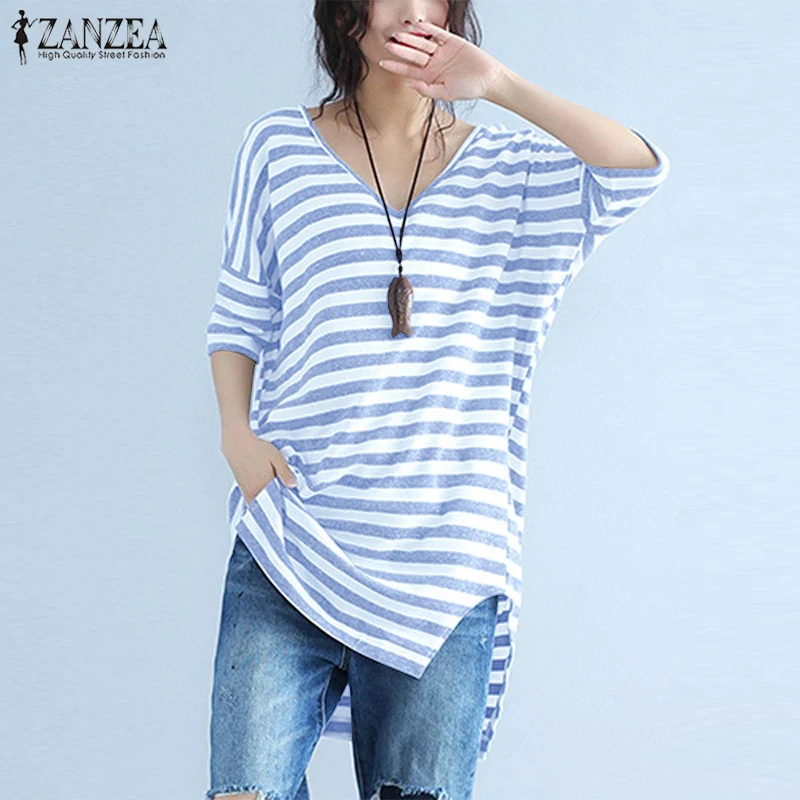 Greatest Women's Asymmetrical Blouse 2019 ZANZEA Femme Striped Tops Casual V Neck Tunic Tops Split Short Sle