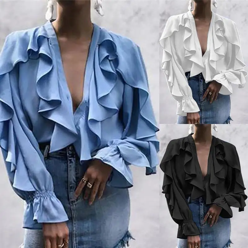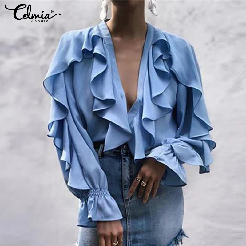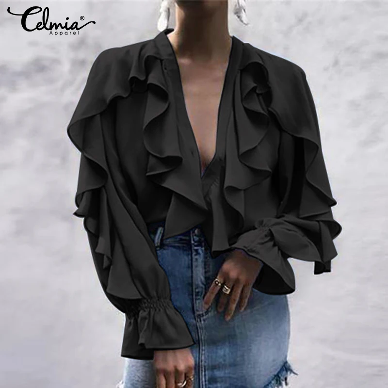 discount Women's Blouse Shirt Celmia Sexy V neck Long Sleeve Female Casual Ruffle Shirt Button Solid Street