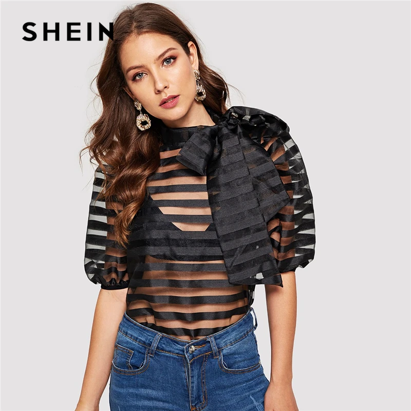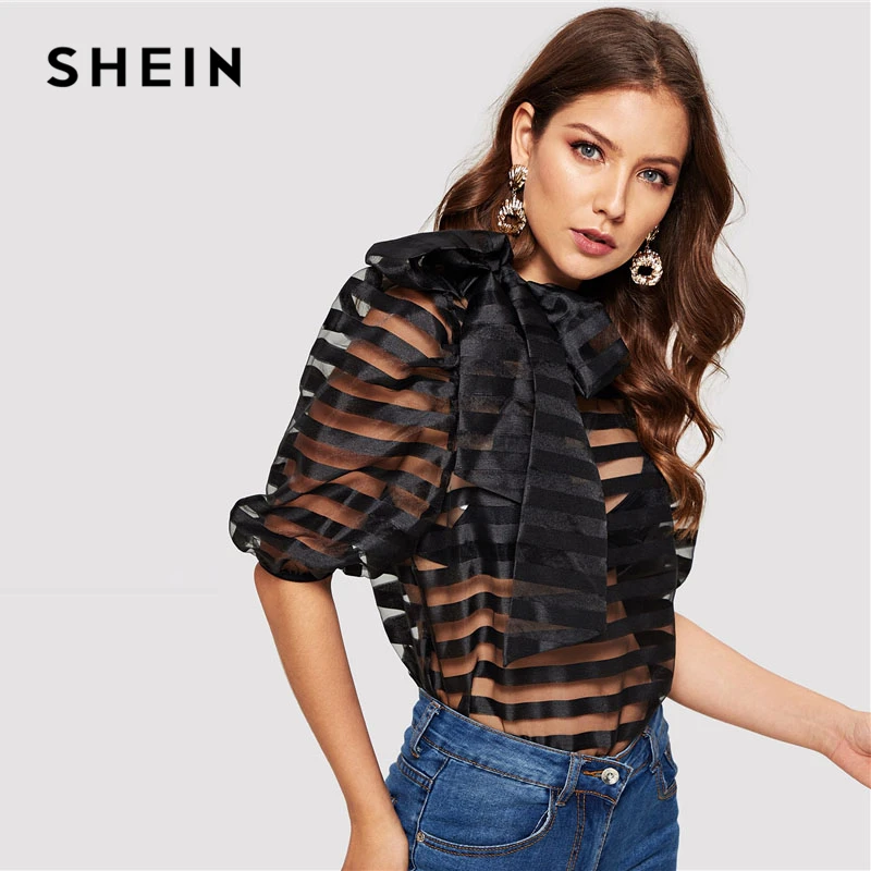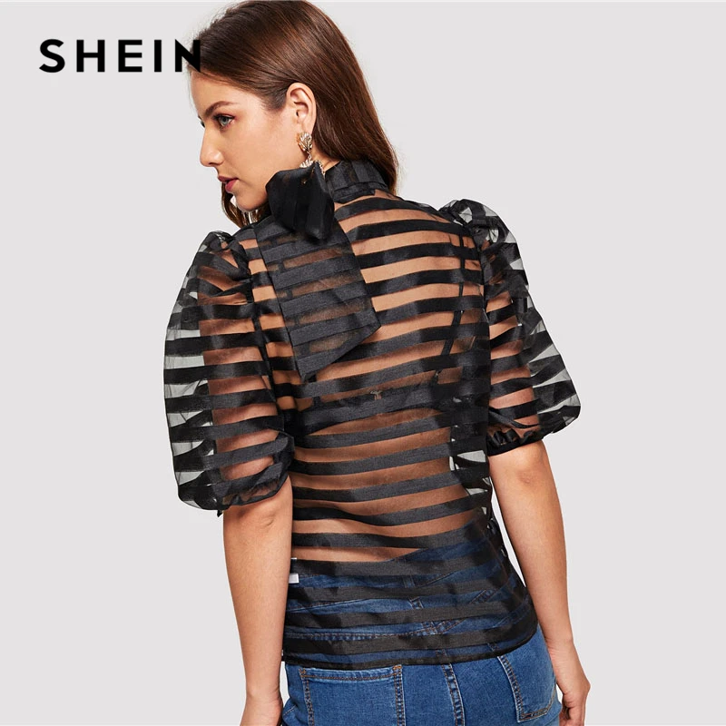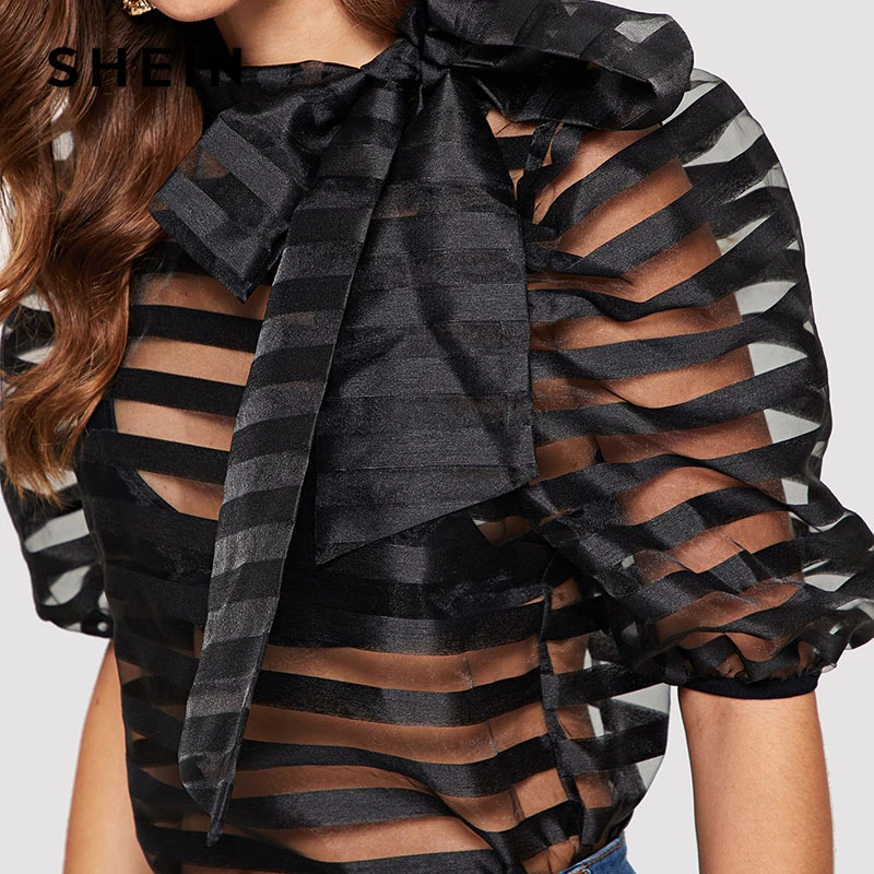 Very best SHEIN Black Tie Neck Puff Sleeve Striped Sheer Top Without Bra Mesh Blouse Women Spring Sexy HighSt