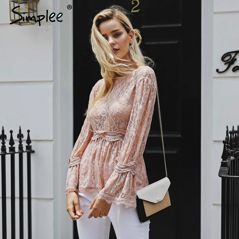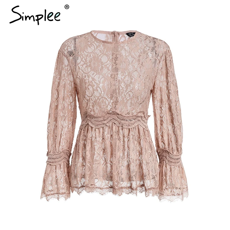 lower price Simplee lace embroidery peplum blouse shirt women Elegant ruffles flare sleeve white blouse female