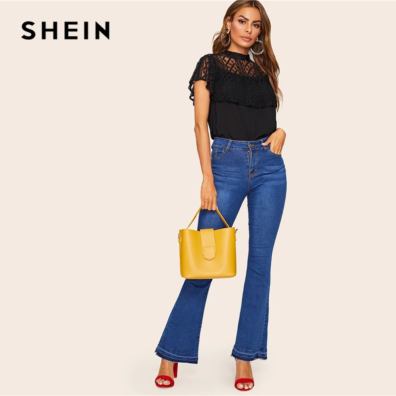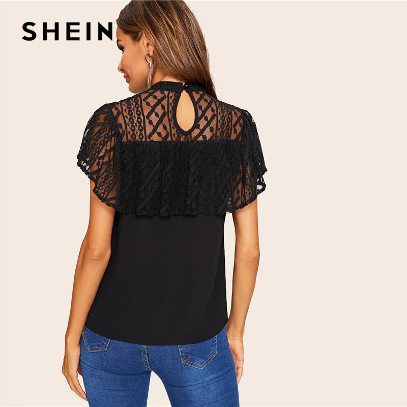 SHEIN Black Elegant Floral Lace Insert Flutter Sleeve Blouse Ladies Tops Summer Short Sleeve Stand Collar Solid Womens Tops,SHEIN Navy Tie Neck Lace Shoulder Contrast Mesh Button Top Blouse Spring Weekend Casual Round Neck Women Tops And Blouses, SHEIN Navy Tie Neck Lace Shoulder Contrast Mesh Button Top Blouse Spring Weekend Casual Round Neck Women Tops And Blouses