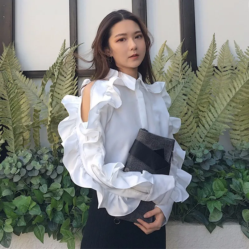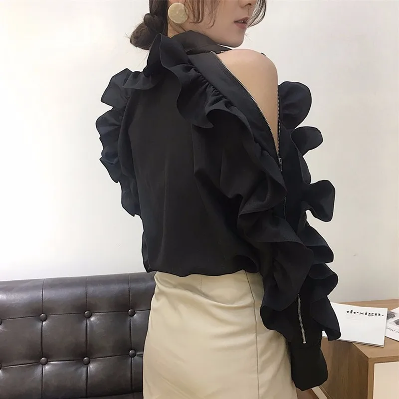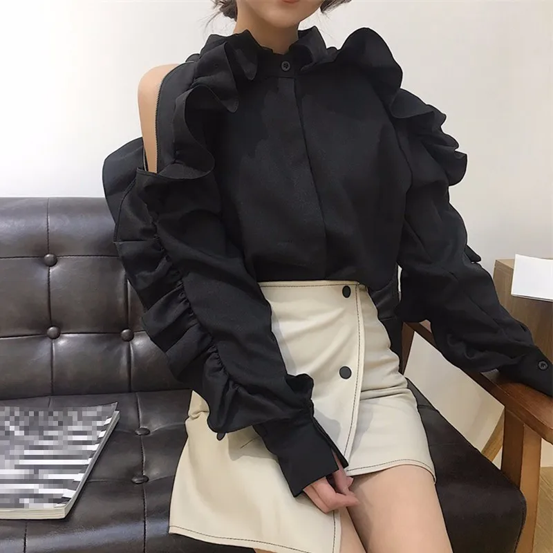Promo TWOTWINSTYLE Off Shoulder Shirt Female Ruffles Patchwork Lapel Collar Zipper Long Sleeve Blouse Wom