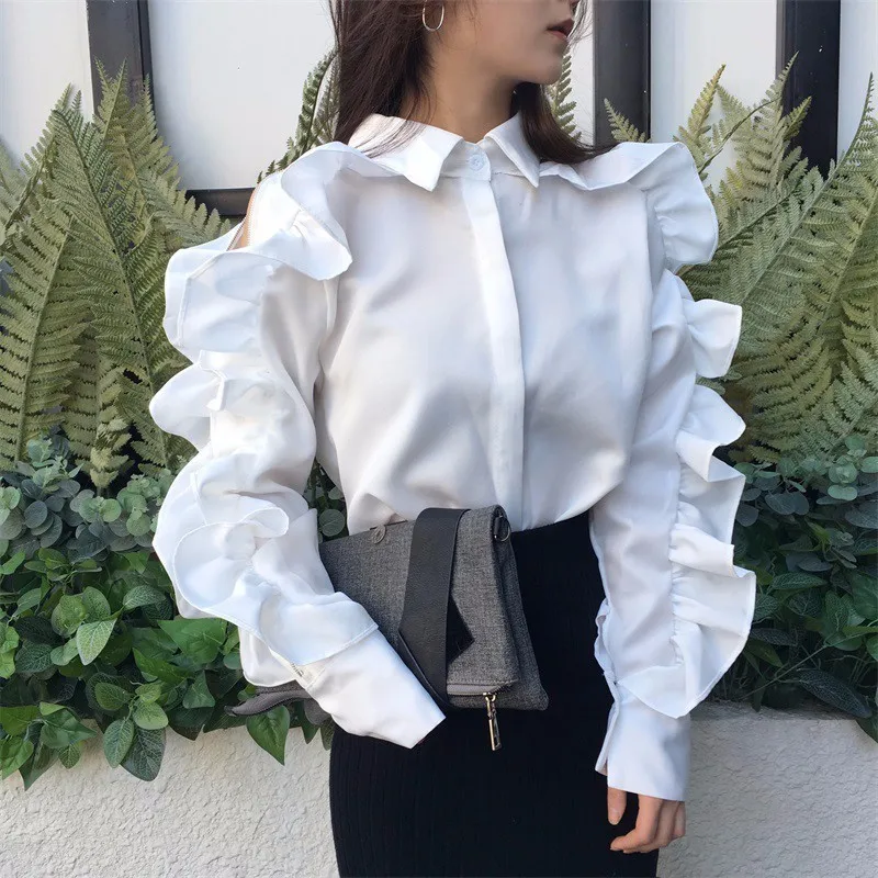 Best TWOTWINSTYLE Off Shoulder Shirt Female Ruffles Patchwork Lapel Collar Zipper Long Sleeve Blouse Wom
