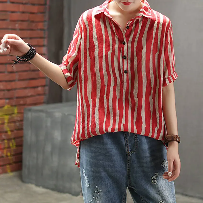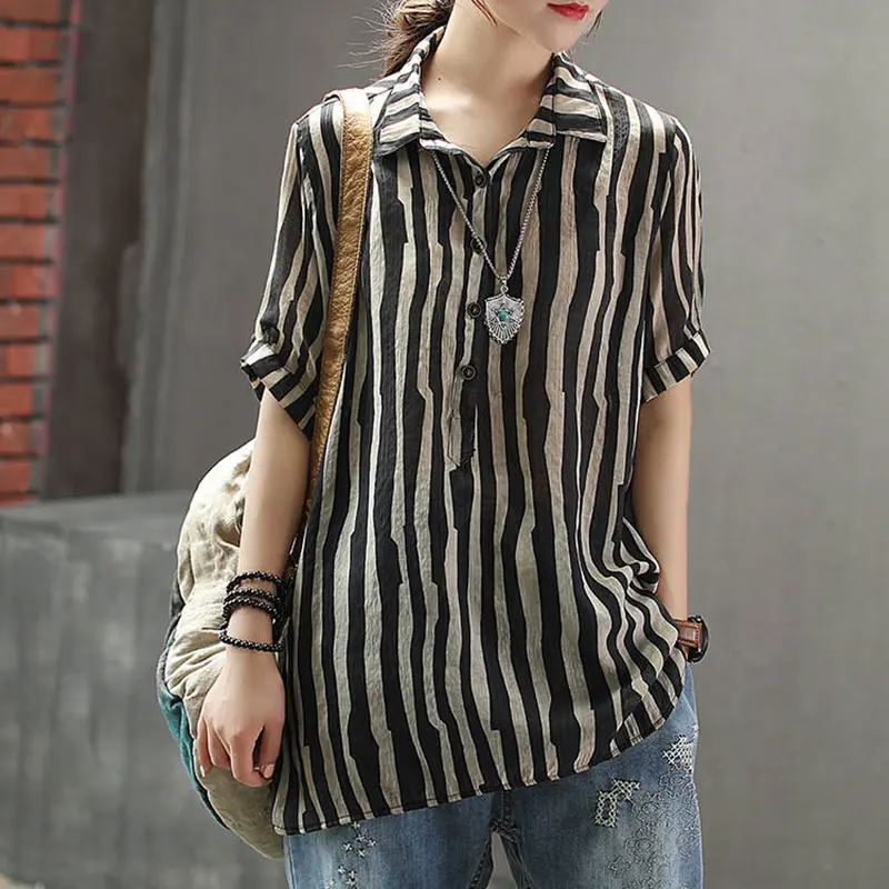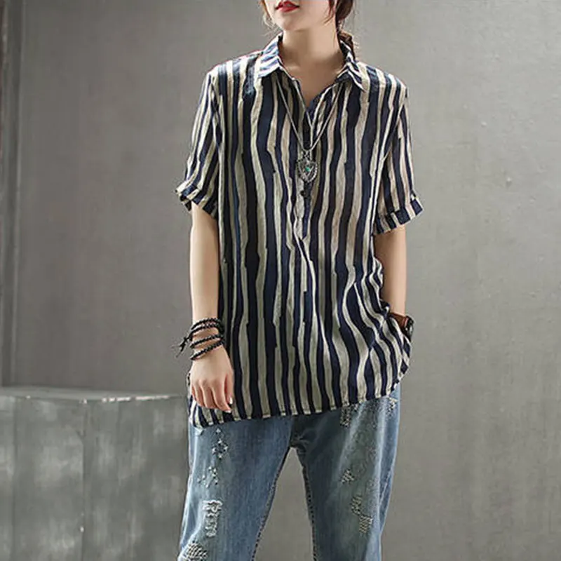 Best F&je New Style Summer Women Shirt Plus Size Short Sleeve Loose Casual Ladies Tops Striped Cotton Li