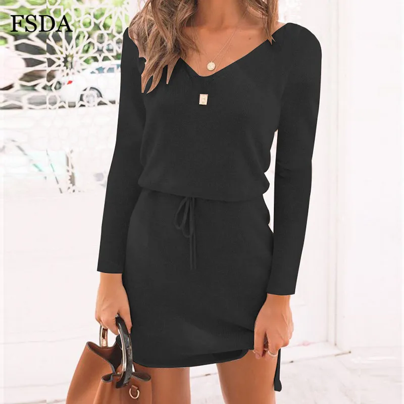 astounding FSDA V Neck Women Sashes Long Sleeve Casual Dress Pink Black Gray Slit Mini Autumn Winter Knitted 2