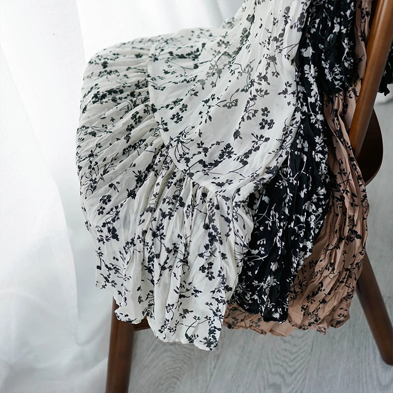 lower price 2019 White Chiffon Dress Korean Floral Printing Ruffles Midi Dress Pleated Hem Elegant Party Vestid
