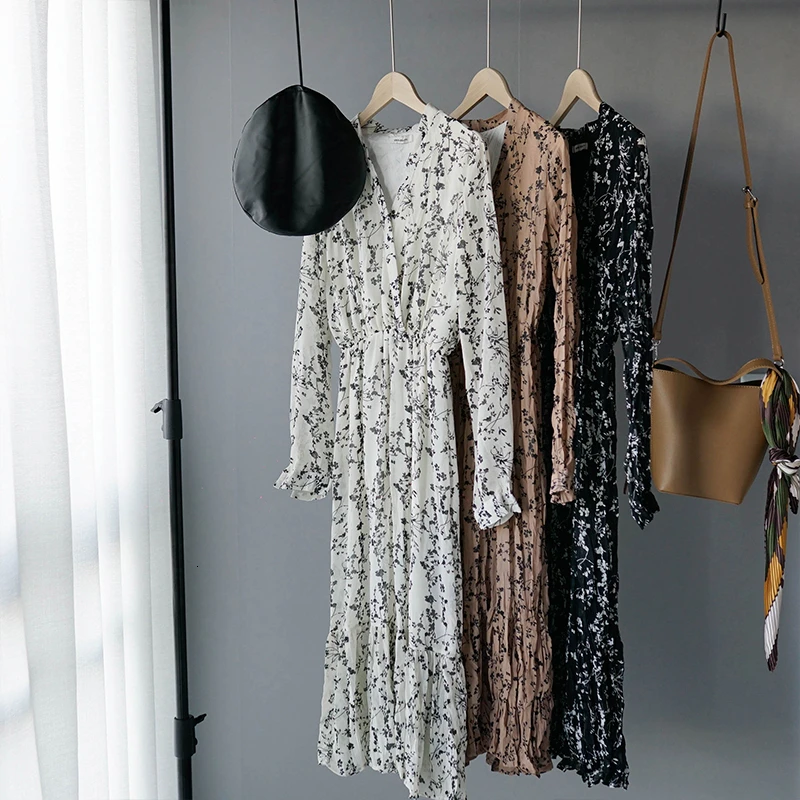 Greatest 2019 White Chiffon Dress Korean Floral Printing Ruffles Midi Dress Pleated Hem Elegant Party Vestid