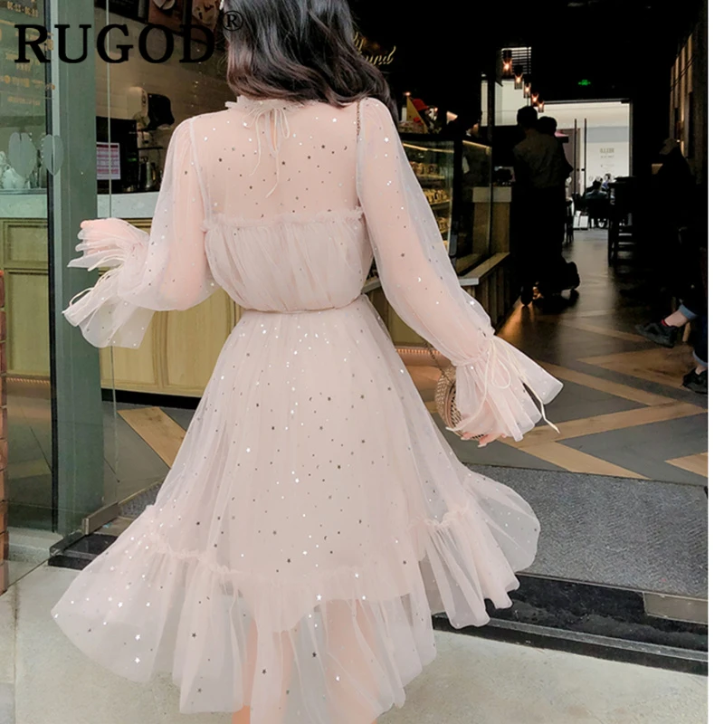 amazing RUGOD New shiny women dress sequined transparent loose a line mesh patchwork elegant solid summer d